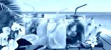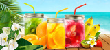 Summer refreshing exotic drinks cocktails in glass jars with tropical fruits on wooden table on seascape background.