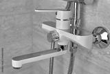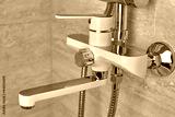 Water tap in the bathroom. Mixer cold and hot water, close-up. Modern shower wall system. Water system with shower in the bathroom