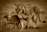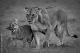 Lion cub walks beside lioness shaking head
