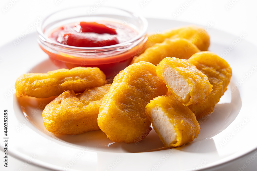 Chicken nuggets and ketchup on a plate placed on a white background.