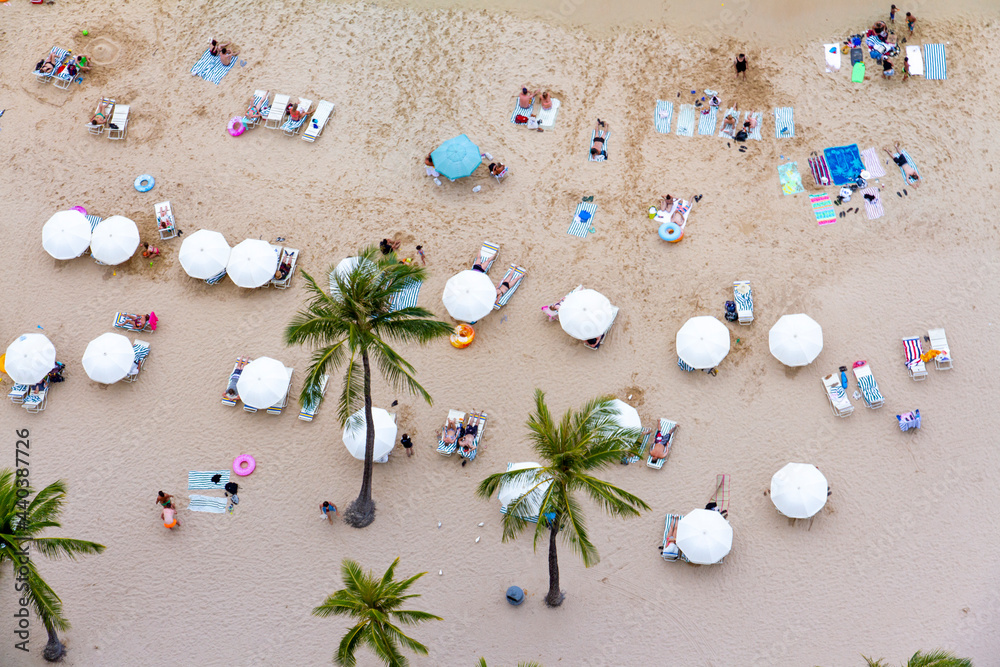 Beachgoers relaxing on the beach with beach umbrellas and towels on Waikiki Beach, Hawaii