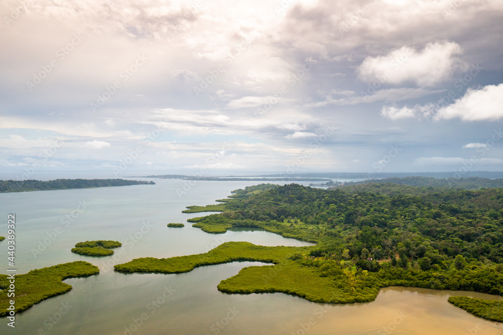 Tropical Island Aerial View. Wild coastline lush exotic green jungle. Red Frog Beach in Bastimentos Island, Bocas del Toro, Central America, Panama.