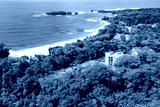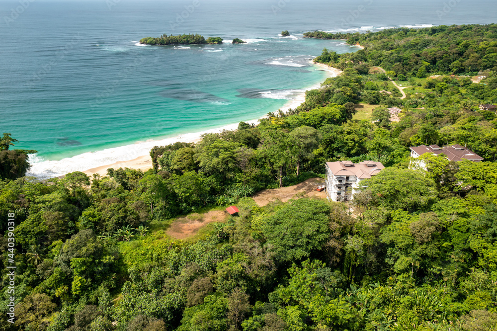 Tropical Island Aerial View. Wild coastline lush exotic green jungle. Red Frog Beach in Bastimentos Island, Bocas del Toro, Central America, Panama.