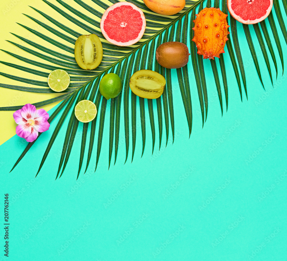 Fashion swimsuit and sunglasses with beach toys. Top view of beach summer accessories for children. Modern set for vacation. Flat lay