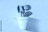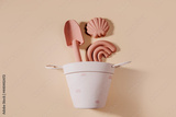 Modern set of beach toys for children. Flat lay composition with kit baby summer tool and bucket for water game and play with sand.
