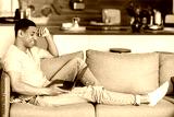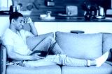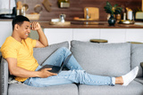 Positive attractive hispanic guy sitting on a sofa at home in the living room, using a laptop, browsing the Internet, chatting online on social networks, shopping online, looking at laptop, smiling