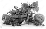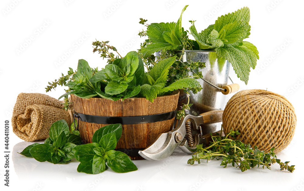 Spicy herbs in basket. Gardening farming. Still life with fresh spice mint oregano and thyme. Isolated on white background.
