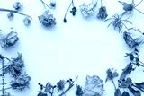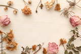 ヴィンテージ風の色々なドライフラワーのフレームと木目の背景