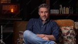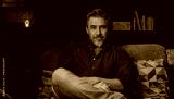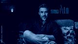 Portrait of older man at home in dark room sitting on couch. Happy smile, grey hair, bearded, . mature age, middle age, mid adult man in 50s.