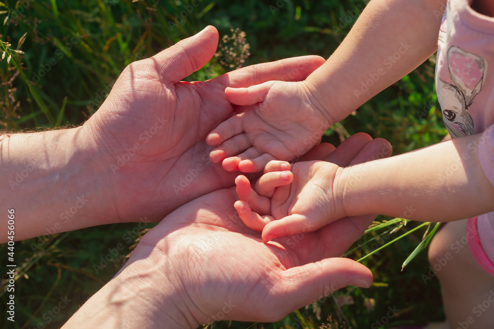 Small hands of the baby in the big hands of the father, the concept of fatherhood and family