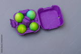 Easter eggs in a purple cardboard egg box on a gray background for the Easter holiday. Copy space