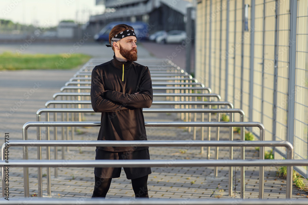 Fit man doing triceps dips on parallel bars at park exercising outdoors