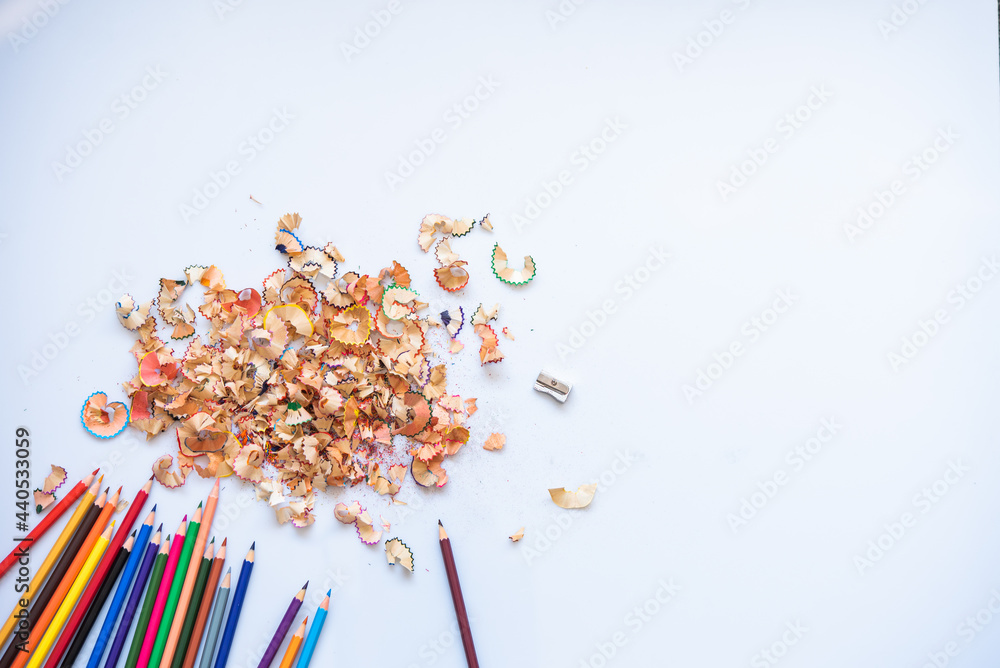 Sharpend crayons on a white background. Pencil shavings, different colors crayon pencil scrap. pencil peels. pencil sharpener