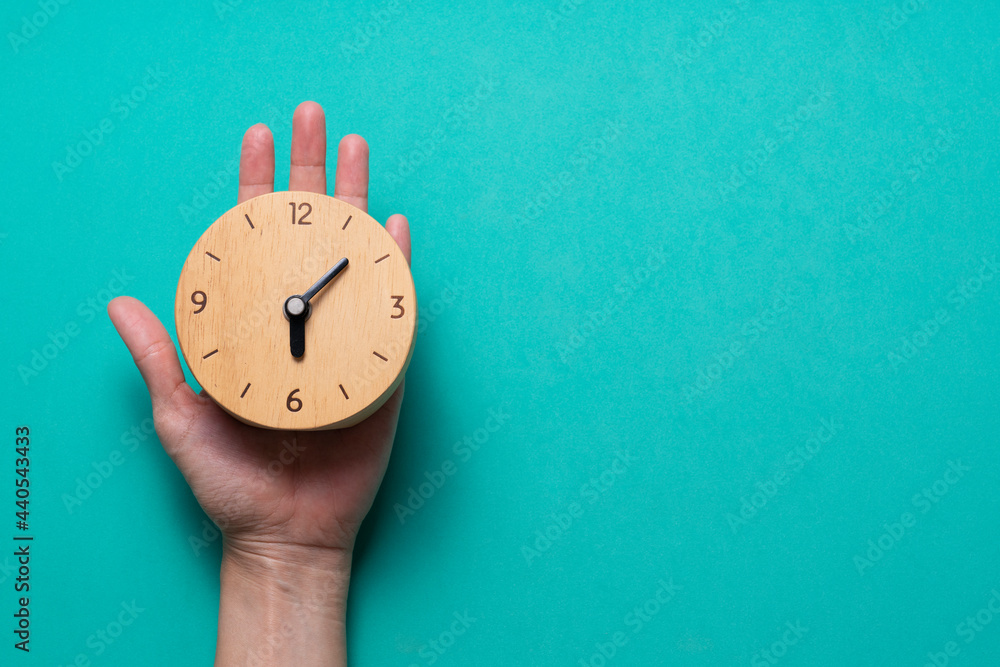 Hand of woman holding retro alarm clock on green table background, vintage style