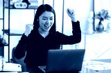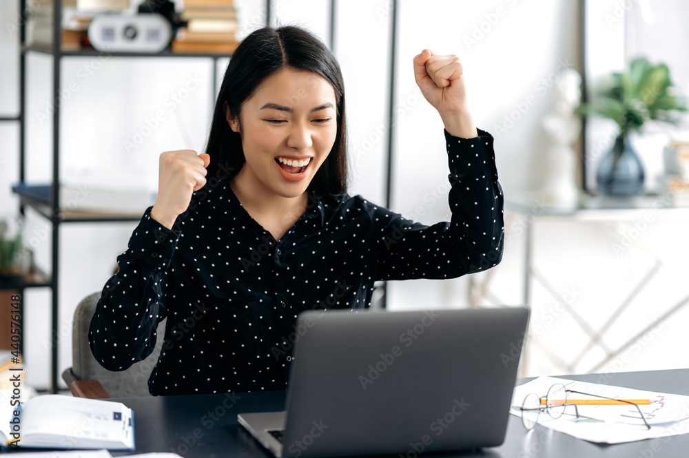 Happy positive successful asian young woman, stylishly dressed, office worker, freelancer or student sits at work desk, gesturing with her hands rejoicing in victory, success, good deal, big profit