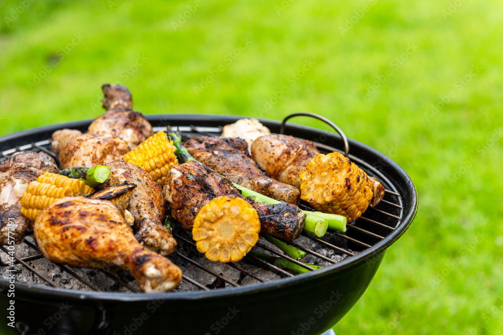 Chicken Drumstick Legs Grilling on Charcoal BBQ. Summer Picnic Food in Backyard Garden