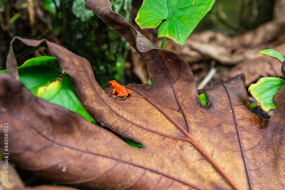 Red Frog in Panama. A red strawberry poison-dart frog at the Red Frog Beach, Bastimentos Island. Bocas del Toro, Central America. Panama.