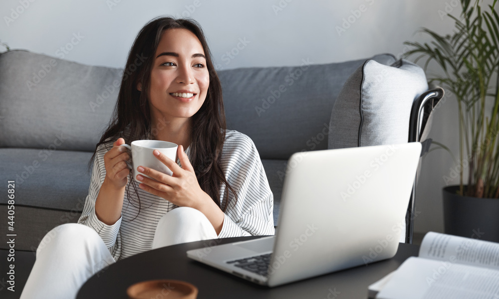 Portrait of a young happy female freelancer sitting on floor and working on project, watching movie on laptop, studying, blogging, resting and chatting online. High quality photo