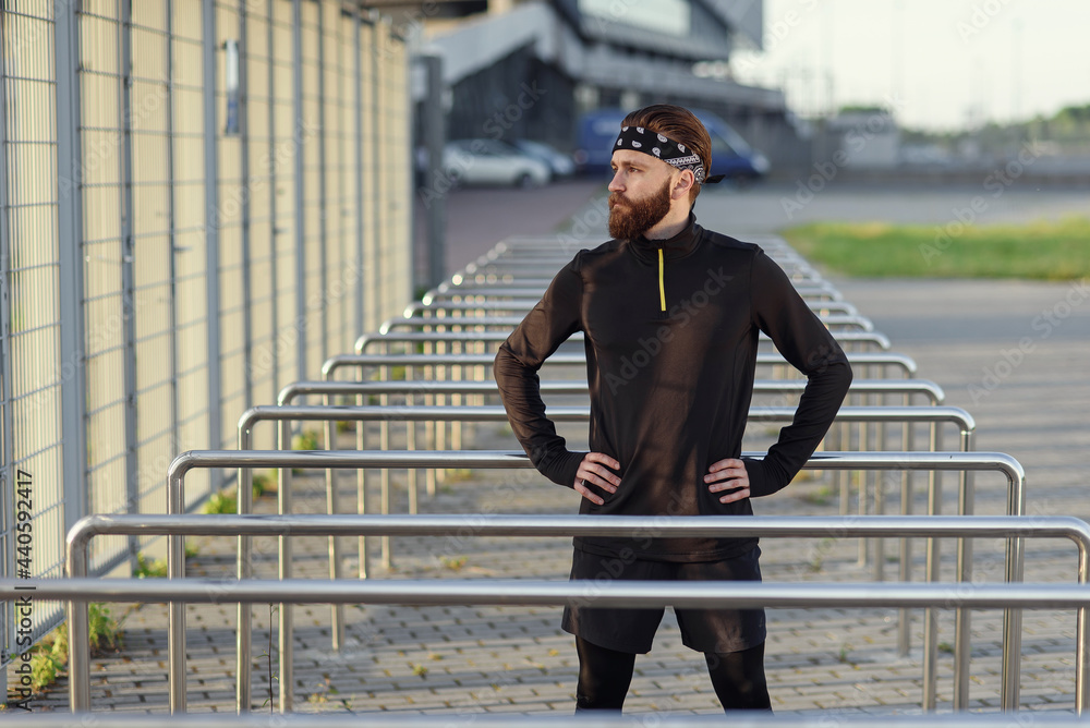 Fit man doing triceps dips on parallel bars at park exercising outdoors