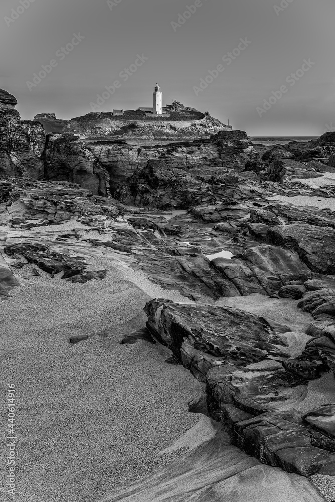 Beautiful and unusual landscape image of landmark Godrevy lighthouse on Cornwall's coastline