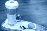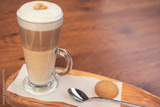 Cafe latte macchiato layered coffee in a see through glass coffee cup. The cup is on a wooden background with coffee cookie on the table next to the cup.