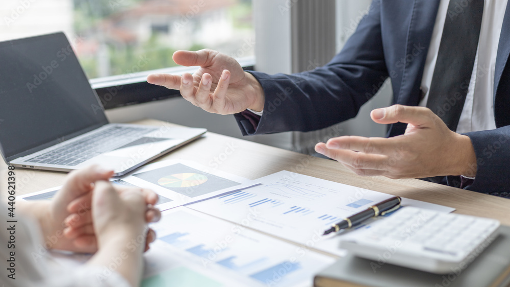 Brainstorm team, Marketers and financial accountants are discussing and analyzing charts to plan strategies to meet customer needs, Team meetings or business consulting.