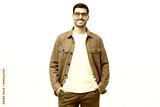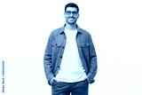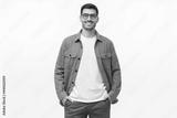 Young man standing with hands in pockets, wearing casual green shirt, looking at camera, isolated on gray background