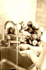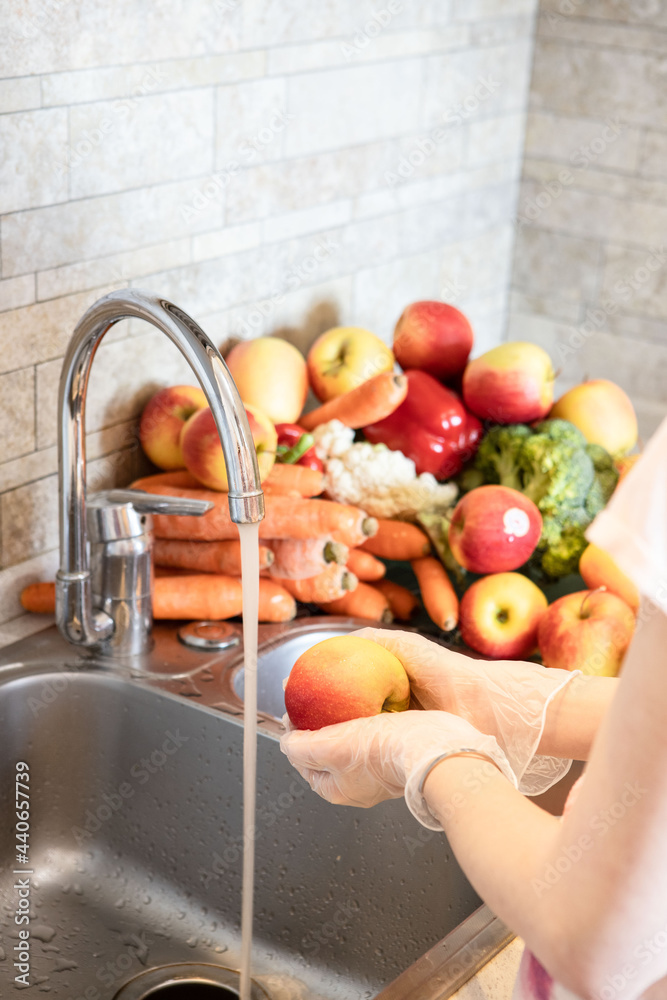 Concept of hygiene, sanitation during pandemic, vitamins, virus protection. Hands in rubber gloves wash vegetables, fruits under tap. Lifestyle. Many colored products at the kitchen sink. Soft focus.