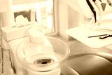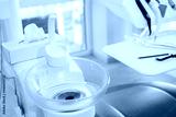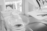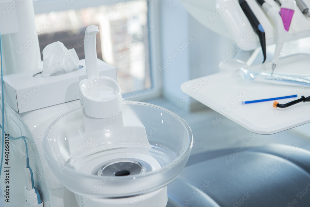 Modern dental office without people. Expensive medical equipment. Selective focus. Light, horizontal. Lamp, tap, chair against the background of a window. Close up. Dentistry Design. New technologies.