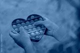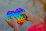 The child plays with a colorful rainbow game of poppit. Silicone fidget close-up.