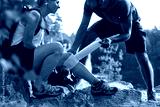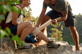 Young caucasian man putting elastic bandage on knee