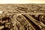 Motorway multilevel crossing. Spaghetti junction on A4 international highway, the part of freeway around Krakow, Poland. Aerial view