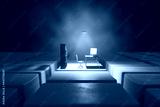 Dark desktop with computer workplace on keyboard keys. Digital transformation and remote work concept. 3D Rendering.