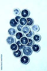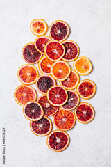 Fresh ripe sliced blood oranges on white background. Top view, flat lay. Colorful blood orange texture background. Flat lay, top view