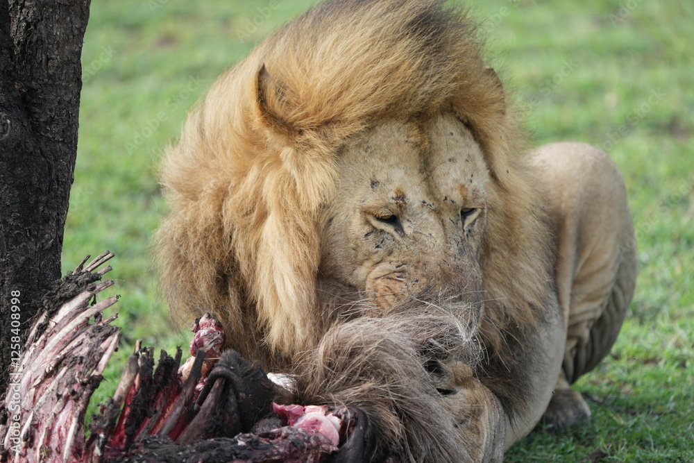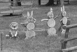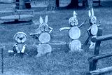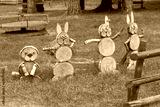 Wooden self-made sculptures of hares from birch tree cuts on a green lawn in summer