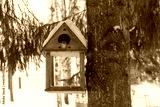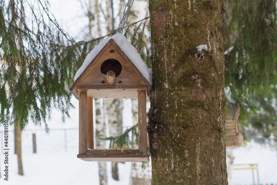 Bird feeder with food in the form of a wooden house hanging on a tree in the winter in the forest or park