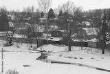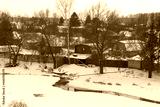 A dirty unfrozen river with sewage flows near a village in Russia in winter