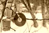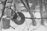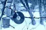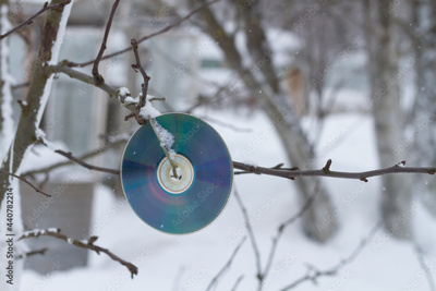 A disk for repelling birds on a tree in winter