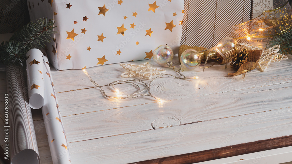 Preparing for the celebration of Christmas. Christmas gifts are wrapped in gold and white paper with golden stars