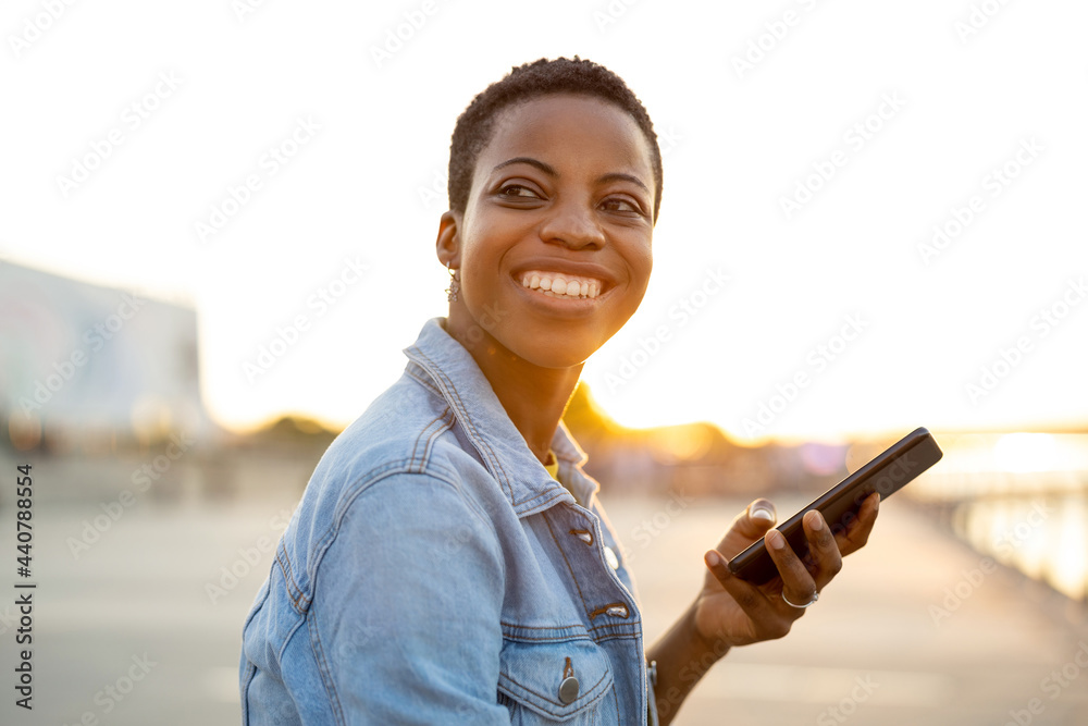Smiling young woman using smartphone outdoors