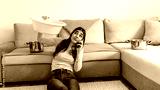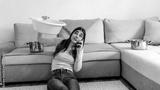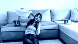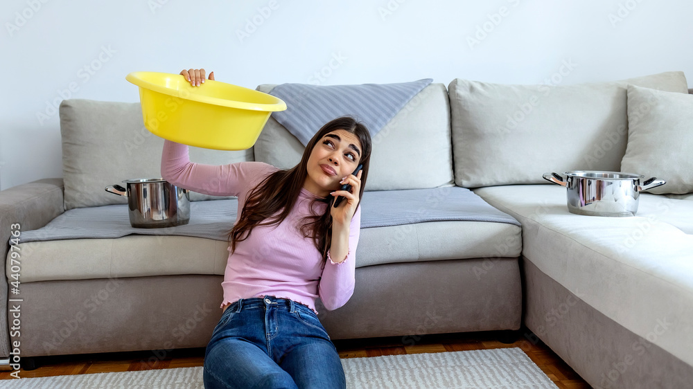 Woman looking up and holding pot under leaking ceiling. Irritated woman sitting on sofa with silver pot. Upset girl calling plumber. Female calling roof repair service while water leaking from ceiling