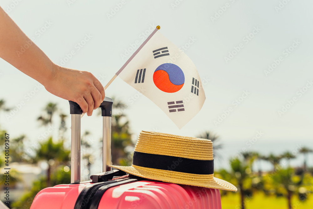 Woman with pink suitcase, hat and South Korea flag standing on passengers ladder and getting out of airplane opposite sea coastline with palm trees.