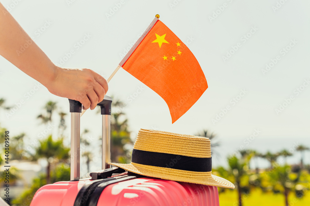 Woman with pink suitcase and China flag standing on passengers ladder and getting out of airplane opposite sea coastline with palm trees.