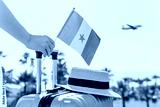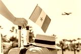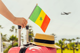 Woman with pink suitcase and Senegal flag standing on passengers ladder and getting out of airplane opposite sea coastline with palm trees.