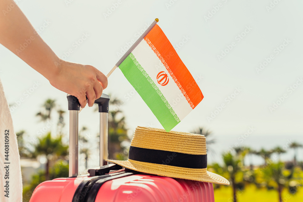 Woman with pink suitcase, hat and Iran flag standing on passengers ladder and getting out of airplane opposite sea coastline with palm trees.