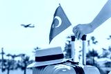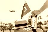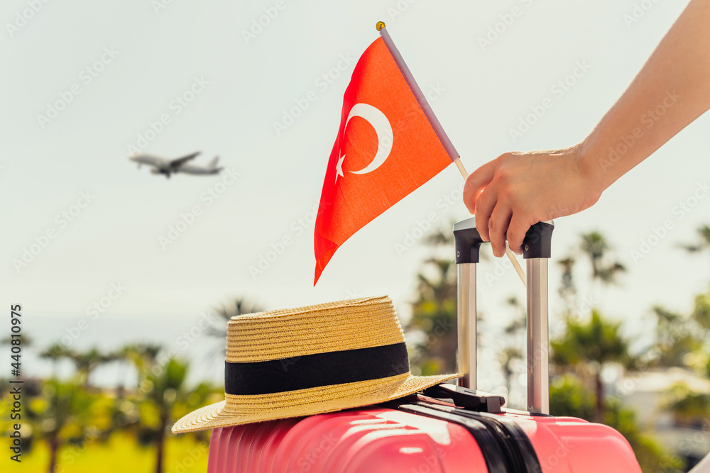 Woman with pink suitcase, hat and Turkey flag standing on passengers ladder and getting out of airplane opposite sea coastline with palm trees.