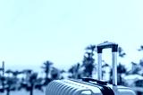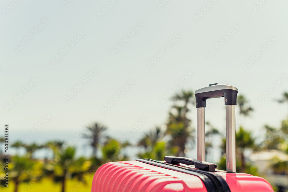 Pink passengers suitcase on ladder airplane opposite sea coastline with palm trees. Tourism concept