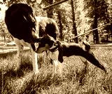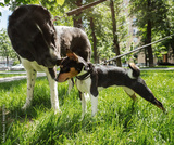 Big and small dogs on leashes getting to know each other sniffing each other while walking on the green grass