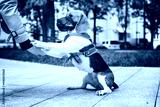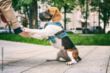 A beagle dog in a harness walking in the city with the owner, performing commands, gives paws