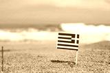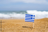Flag of Greece in the form of a toothpick in the sand of beach opposite sea wave. Travel concept